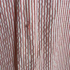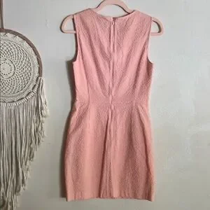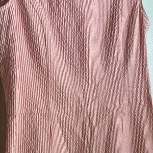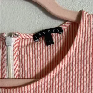 This elegant pink seersucker mini dress by Theory is designed for a chic cocktail night out. With its sleeveless cut and classic crew neck, it offers a streamlined silhouette that is both stylish and sophisticated. There is a small hole at the seam pictured here.