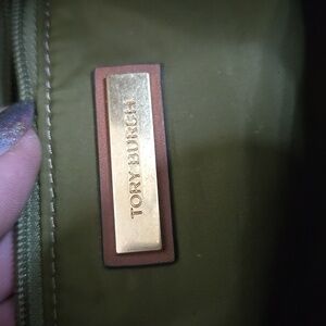 Stylish Tory Burch tote bag in green with brown accents. Perfect for everyday use with a chic design.
