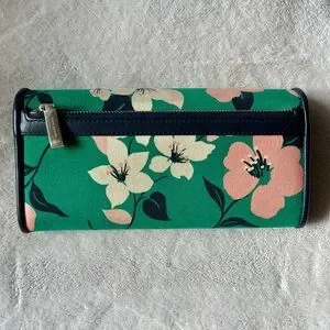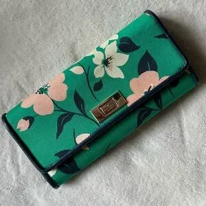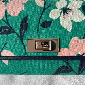 kate spade canvas wallet features a vibrant green floral pattern. Smooth leather trim and logo jacquard linings. Lots of pockets and and 12 card slots!