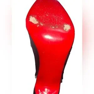 Elegant black slingback heels with signature red soles. Features a stylish bow accent. Heel 4.25”