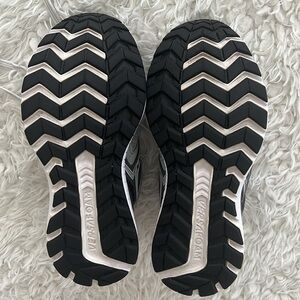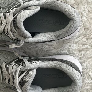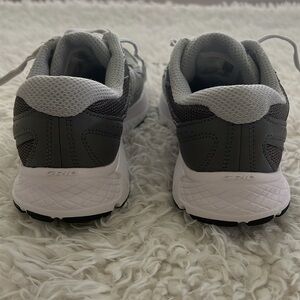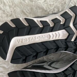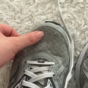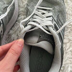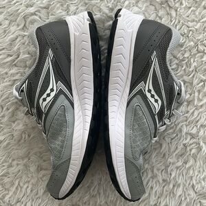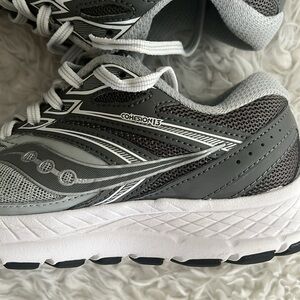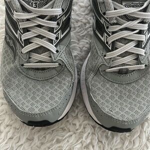 Gray and white running shoes from Saucony. It's from their Cohesion 13 GRID Versafoam collection. They are also Wide. They do have some wear like snags and small rips (shown in the last pictures).