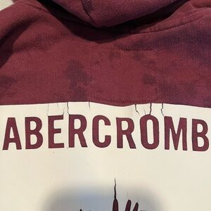 Maroon hoodie zip up sweatshirt with large graphic on back.
