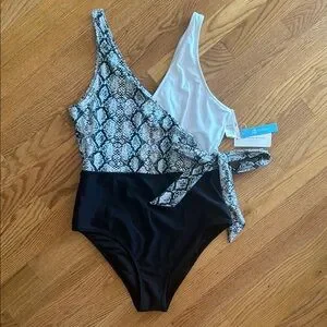 Stylish one-piece swimsuit with a snakeskin pattern and black design. Features a unique side tie detail.