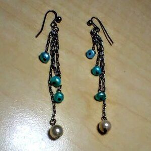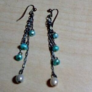 Teal & White Beaded Dangle Chain Earrings : 2 1/4" long