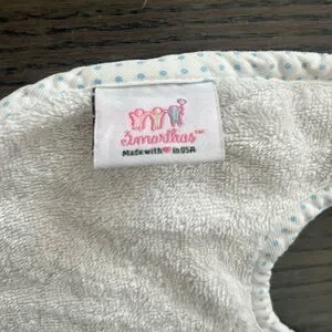 Terry cloth backed bib and seersucker on front with cute bunny appliqué. Velcro closure