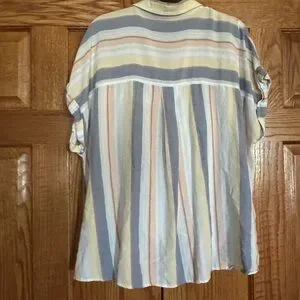 Stylish striped button-up shirt with a front knot detail. Features a pocket and short sleeves. Perfect for casual outings.