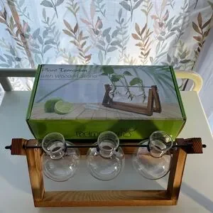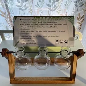 Enhance your home decor with this elegant wooden plant terrarium. Featuring clear glass vases, it's perfect for displaying your favorite plants. The natural wood finish adds a touch of warmth to any room.