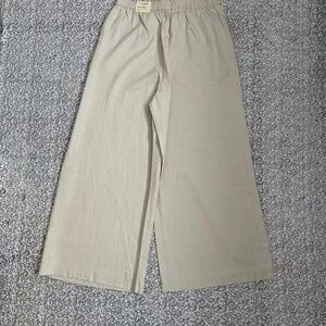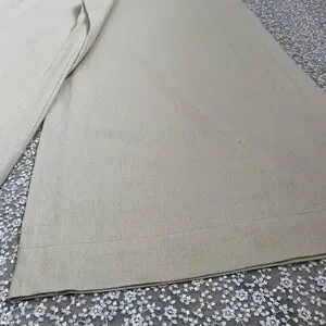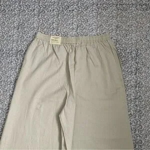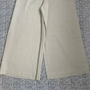 Here is a lovely pair of cream beige wide-leg linen pants. Comfortable and versatile. New with tags attached and in great reusable shape. A woman’s XL size in pants. A mid rise drawstring style. Two front pockets. A nice item to incorporate into your current wardrobe. Measurements below. Please look over the photos. Any questions you may do so. Thanks for stopping by.
