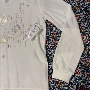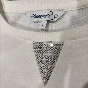 White sweatshirt featuring a Disney castle design with gold and silver accents and Tinkerbell flitting about. Back of sweatshirt has a small Disneyland Paris 30 Years of Magic imprint up near the collar