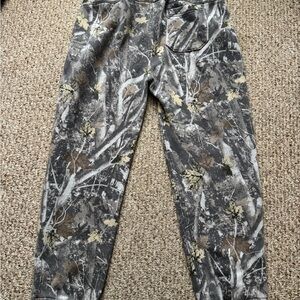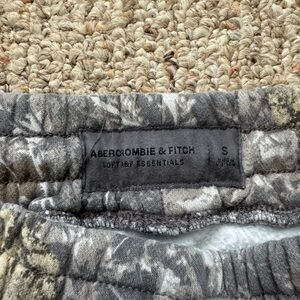 Stylish joggers with a camouflage pattern. Features shades of gray, brown, and cream.
