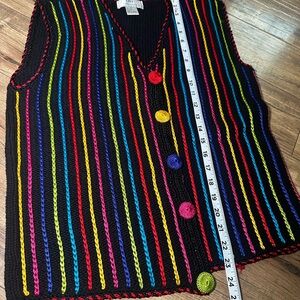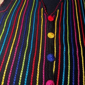 Vibrant and stylish, this sweater vest features a rainbow of colors on a black base. Perfect for adding a pop of color to any outfit.