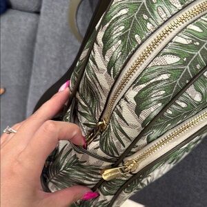 This chic Michael Kors backpack showcases a lush green palm leaf design on a cream backdrop, embodying a fresh, tropical vibe. Ideal for summer outings, it combines style with practicality, making it a perfect accessory for your resort wear. Only used a few times, straps are still like new, zippers work great, has a lot of space to put everything inside of it. Give me your best offer