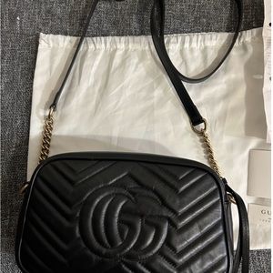 Authentic Pre Loved GG Marmont Leather Crossbody bag! This is a beautiful purse well taken care of. Please see pictures slight rubbing on the corners of the purse. No tears , clean on the inside, receipt, dust bag, Gucci card number included. Please feel free to ask for additional information or pictures.