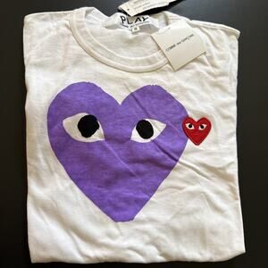 Elevate your wardrobe with the iconic Comme Des Garcons CDG Play Big Purple Heart Tee. Crafted for the modern man, this regular-sized, small white t-shirt from the renowned Comme Des Garcons Play product line is a testament to contemporary fashion. Featuring a distinctive heart theme, it adds a touch of romantic flair to any outfit.