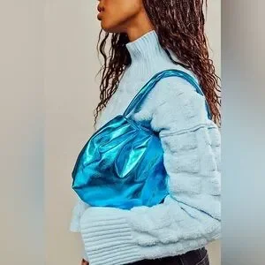 A bold addition to any bag collection, this cool clutch is featured in a smooth vegan leather and shiny finish with a top-zip closure and removable chain. **Features:** Vegan leather with a shiny finish, pleated detail, top-zip closure, cotton-lined interior with zippered pocket, fixed strap with knot, removable chain **Why We ❤ It:** This eye-catching clutch adds an unexpected touch to any outfit. Viva La Vegan Clutch Bag in Blue