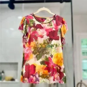 Brighten your wardrobe with this short sleeve vibrant floral top. Featuring a stunning mix of colors, it's perfect for any occasion. Size S. Excellent condition!