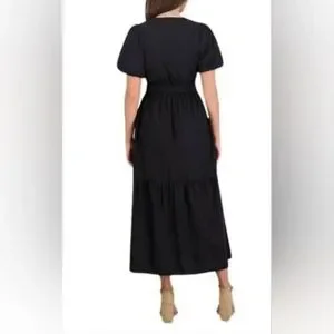 Elegant black midi dress. Features short sleeves and a v-neckline. Perfect for any occasion.