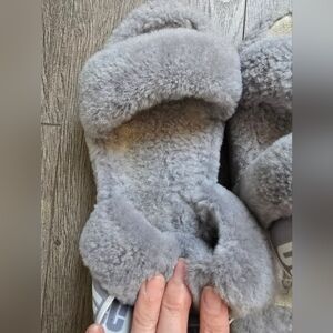 Pre-loved UGG slipper shoes in grey. Inside toe wear, see photos, not noticeable when wearing. Normal wear on the rest of these slippers. I am not able to locate size, I have added measurements and a photo on me wearing them. I wear a 7.5-8, and they fit good, see photo.
