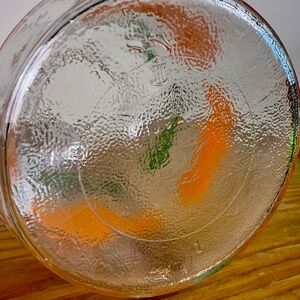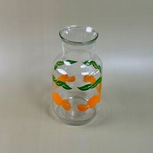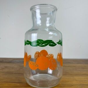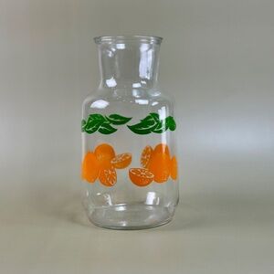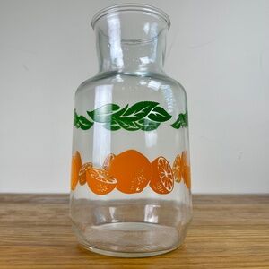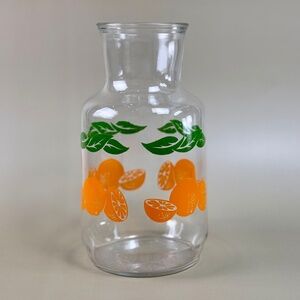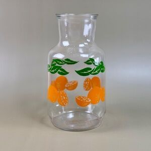 Brighten up your breakfast table with this cheerful vintage orange juice jug by Anchor Hocking. Featuring vivid orange citrus graphics and a bold green leaf band, this classic 1970s glass carafe blends playful retro charm with everyday functionality.