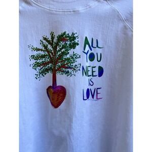 Wet Cat white cropped graphic sweatshirt with a tree and heart design. Features the phrase "All You Need Is Love" in colorful lettering.