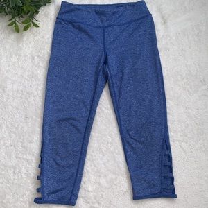 Nice pair of blue capri leggings with cut outs at bottom of leg. In excellent, clean condition!