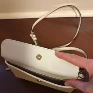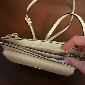 Elevate your style with this elegant Kate Spade crossbody bag. Featuring a chic cream and tan design, it's perfect for any occasion. It is a wallet type bag, narrow, yet functional. Iphone14pro max does Not really fit, fyi.