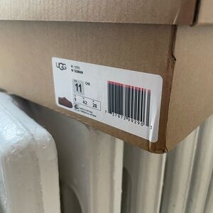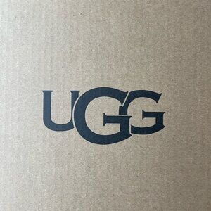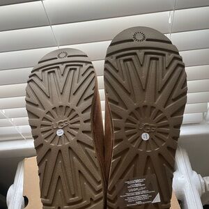 Cozy brown suede slippers with plush lining. Features UGG logo and detailed stitching.