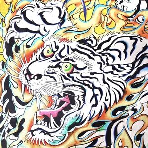 Own a piece of wearable art with this vintage Ed Hardy scarf. This eye-catching accessory features a vibrant design with four white tigers roaring against a fiery orange backdrop, accented with black, blue, and red details. Measuring approximately 39x39 inches, this scarf is perfect for adding a bold touch to any outfit. Made from a soft, lightweight material, it can be styled in numerous ways - wear it around your neck, tie it to your handbag, or use it as a headscarf. This vintage piece captures the iconic Ed Hardy aesthetic, blending tattoo artistry with contemporary fashion. A true collector's item, this scarf is a must-have for any fashion enthusiast looking to make a statement.