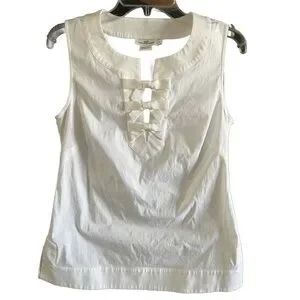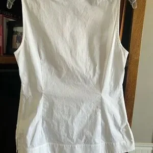 This elegant white blouse from Vineyard Vines features a chic tie front and a distinctive bib collar, offering a sophisticated touch to any outfit. The blouse is designed with a comfortable fit and crafted from lightweight fabric, making it perfect for warm weather. 16 inches put to pit 24 inches and length. Fabric is 97% cotton 3% spandex. Has stylish slips on either side at the bottom Its stylish design ensures versatility, suitable for both casual and formal occasions.