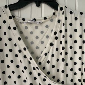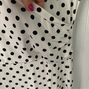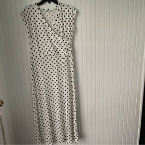 Chic and stylish polka dot maxi dress in classic black and white. 18 1/2” pit to pit; 50” shoulder to hem. Buttersoft fabric. Also had a tie for the waistline.