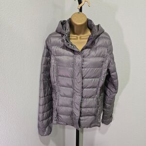32 Degrees Hooded Jacket Women Lg Down Quilted Zip Puffer Packable Gray Gorpcore