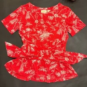 This Anthropologie blouse features a charming tie front and short sleeves, crafted in a delightful red palette. The airy fabric and elegant design make it an ideal choice for warm weather, offering both style and comfort.