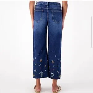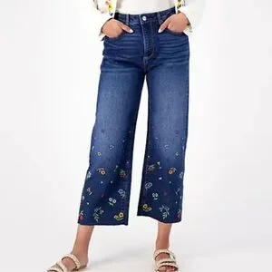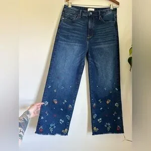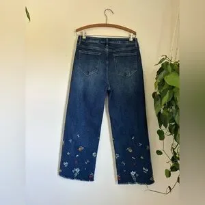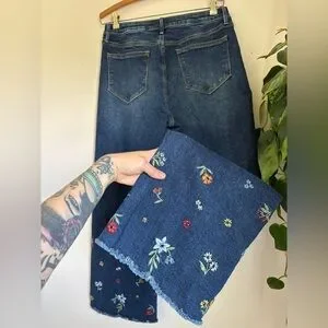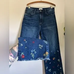 Driftwood Charlee Wide Leg Denim- this is such a gorgeous dark wash, with a wide leg fit & a stunning floral embroidery at the bottom. 100% cotton, with an intentional raw hem finish at the ankles.