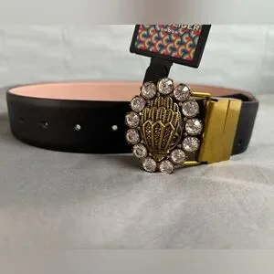 This elegant Kurt Geiger women's belt features a striking black design with a luxurious rhinestone accented eagle motif gold buckle, smooth leather finish, reversible, 7 pin hole closures, 1.5” wide, 38”L from end of buckle to end of belt