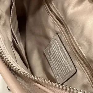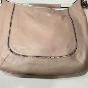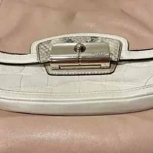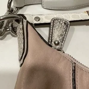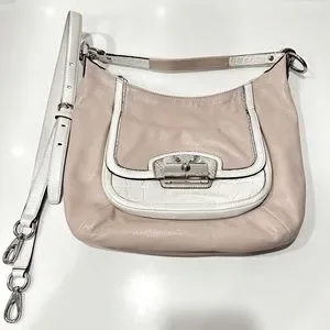 Elegant Coach shoulder bag. Soft pink body with white accents. Silver hardware. Adjustable strap.