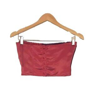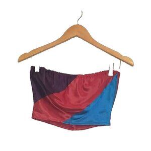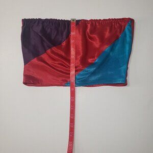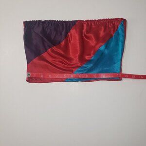 • Vintage bandeau satin top in red, purple & turquoise color-block front and red back with covered buttons.