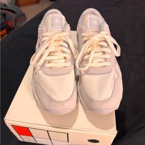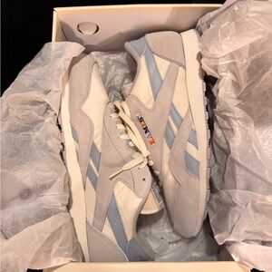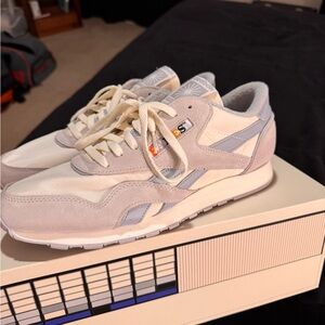 Stylish Reebok athletic shoes. Cream and gray design. Comfortable and versatile.