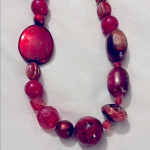 This exquisite necklace features a striking array of red beads in diverse shapes and sizes, centered around a prominent round bead. The asymmetrical design offers a unique flair, while the polished finish adds a touch of sophistication. Matching earrings in closet for sell.