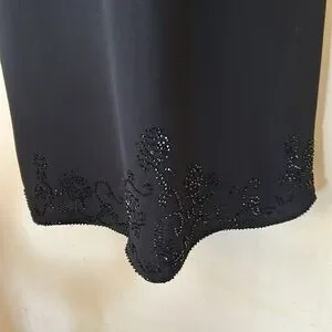 Jones New York jet black beaded sheath dress. This dress features a sweetheart neckline with beaded embellishment all the way around. Lightly padded shoulders and a slim silhouette. It is a tea length with beaded hem. Quiet elegance! Like new condition
