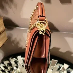 This elegant shoulder bag showcases a luxurious diamond quilting pattern in a warm brown hue, complemented by gold-tone chain straps and hardware. Its structured, flap-style design offers both style and functionality, making it a standout accessory for any occasion.