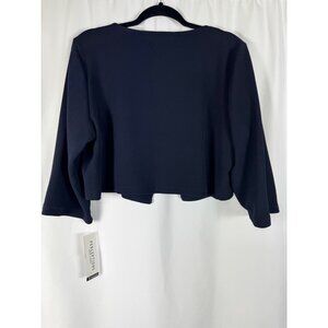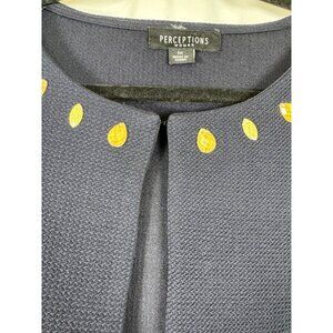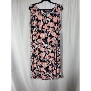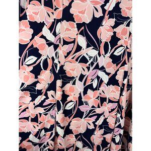 Perceptions 2 piece shift dress and shrug set. Sleeveless dress is navy blue with blush floral pattern. Navy blue shrug has a textured knit and 3/4 length sleeves. Closes with a hook & eye at neckline. Shrug is embellished with jewel beads along neckline (one of which has come loose and, while intact, will need to be reinforced). Both pieces are unlined, with lots of stretch.
