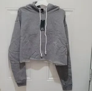 This cropped hoodie is made from a cotton-blend fabric and cut in a relaxed silhouette with drop shoulders. The attached hood features a white drawstring for contrast, and a rolled, raw hem finishes off the look. Machine Wash. This is an women's size M.