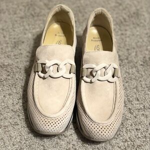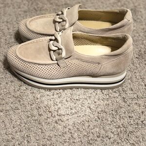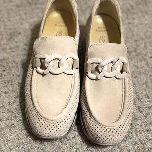 Step out in style with these elegant beige loafers. Featuring a distinctive chain detail, these shoes offer both comfort and sophistication. Perfect for any occasion.