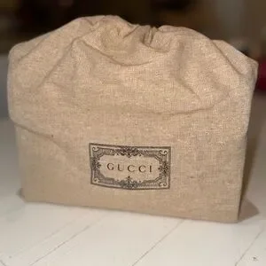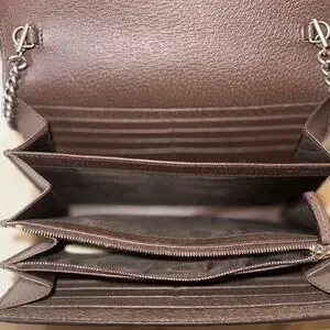 Stylish Gucci shoulder bag in beige and brown. Features a chain strap and signature logo design.