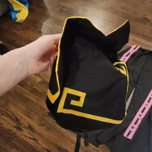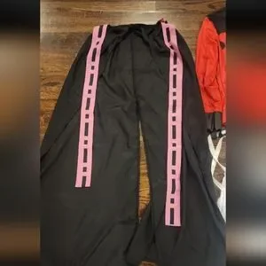 Vibrant red and black costume set featuring a striking top and wide-leg pants. Includes unique accessories for a complete look.