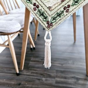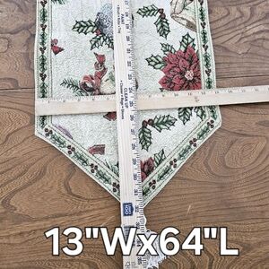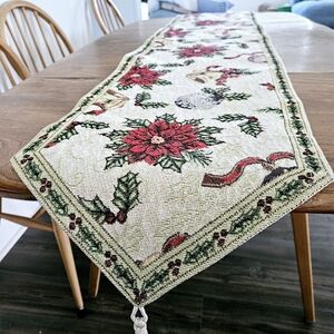 Christmas Holiday Lined Tablerunner with Tassle Ends Poinsettias Jingle Bells Ornaments Pattern Motif Design. Measures 13"Wx64"L.