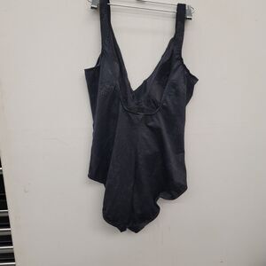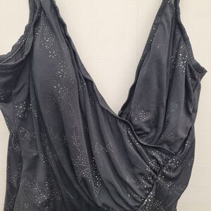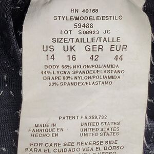 Look stunning in this Miraclesuit One Piece Swimsuit with Surplice Neck and Ruched Bodice. The black color with raised petite silver pattern makes it a stylish choice for the beach or pool. Designed with slimming features, built-in bra, and tummy control, it provides a comfortable and flattering fit for women size 14. Made of nylon and spandex, this swimsuit is perfect for a day out in the sun.