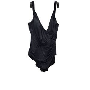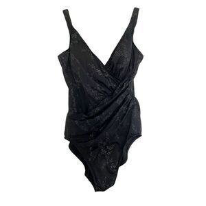 Miraclesuit One Piece Swimsuit Surplice Neck Ruched Bodice in Black/Silver 14