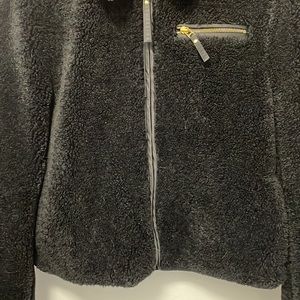 Luxurious black shearling jacket. Features gold zipper accents. Perfect for stylish warmth.