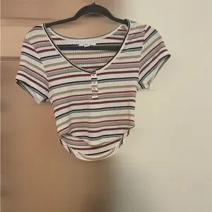 This O'Neill top features a stylish cropped design with a fitted silhouette, perfect for a casual summer look. The short sleeves and buttoned details add a touch of elegance, while the white and brown color scheme offers a versatile and trendy appeal.